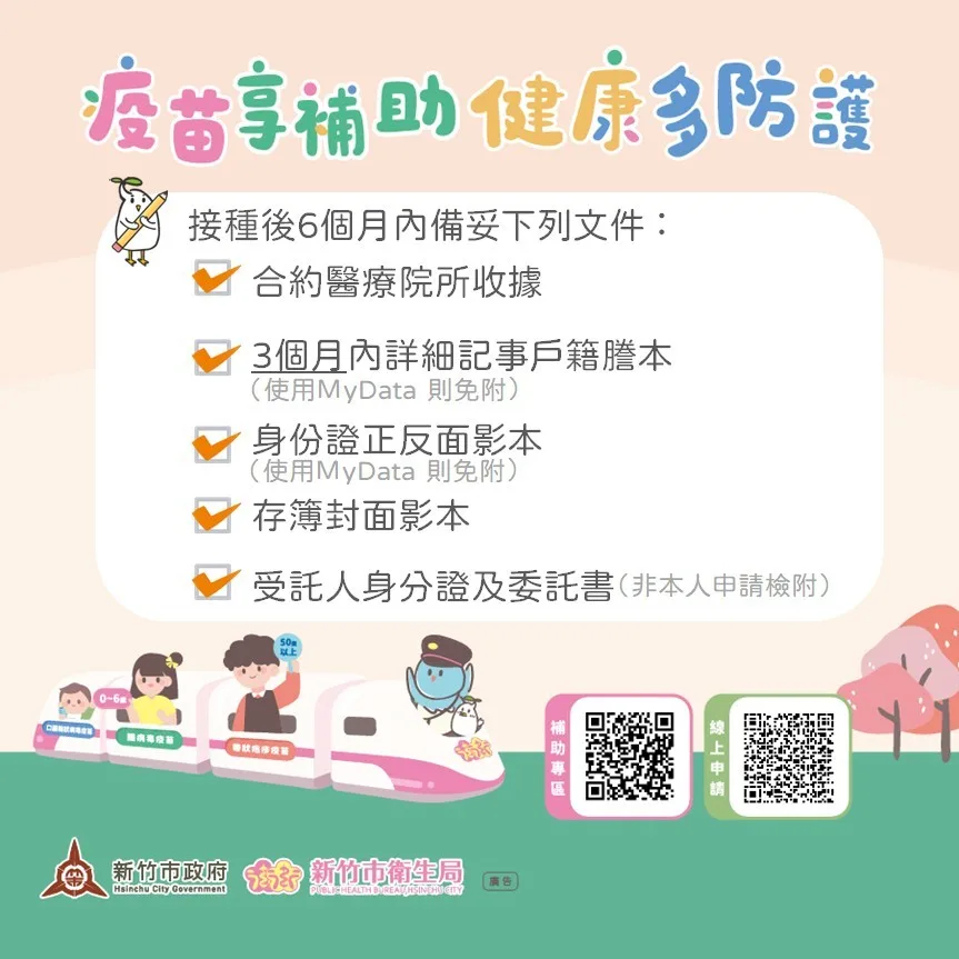 【客庄中心/綜合報導】新竹市政府2026年持續提供自費疫苗補助。凡設籍竹市0-6歲幼兒自費接踵口服輪狀病毒疫苗、腸病毒疫苗及50歲以上民眾自費接種帶狀疱疹疫苗,接種後6個月內可申請每人一次性2000元補助。