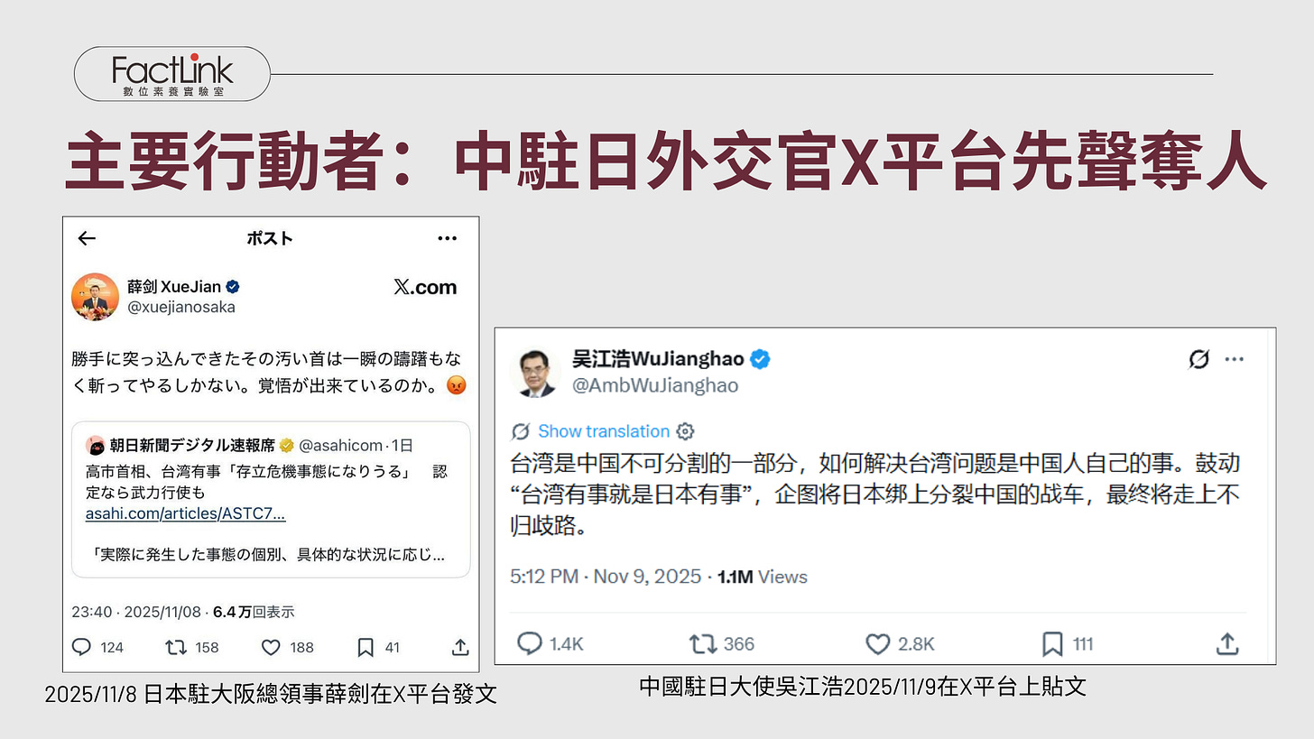 主要行動者:中駐日外交官X平台先聲奪人 官媒與大V接力擴散