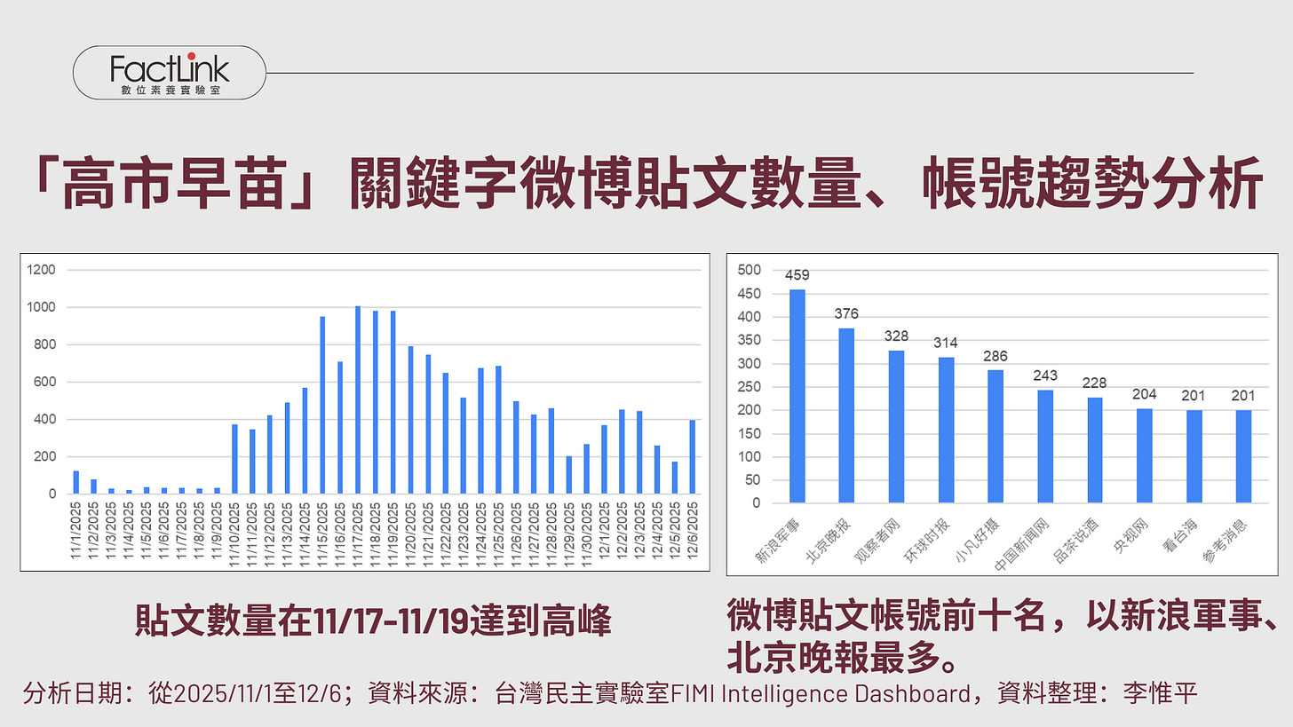 FactLink使用台灣民主實驗室所提供的FIMI Intelligence Dashboard平台,蒐集從11月1日至12月6日(高市早苗11月7日發表「台灣有事論」的一個月後),包含關鍵字「高市早苗」的微博貼文,共計15,241篇。X貼文的分析則是著重中國外交單位與官員的貼文日期與發言內容,並與微博貼文發文日期比較,觀察輿論攻擊的行動者與敘事主軸。
