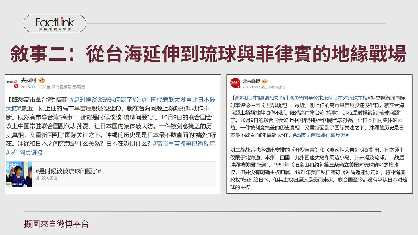 分析11月1日至12月6日與「高市早苗」相關的15,241則微博貼文中,有454篇提及日本對琉球的主權問題與琉球地方領袖與民眾對於日本的不滿。在琉球主權方面,中國官媒如北京日報、北京晚報、環球日報,強調琉球曾是中國藩屬國的歷史,但被日本非法佔領,二戰後琉球雖受美國託管,但實際上琉球主權未定,應由琉球居民自決。這些微博上的官方敘事延續十年來「琉球主權未定論」,強調開羅宣言與波茲坦公告,並未將琉球納入日本領土範圍,而其他國際合約與協定,例如舊金山和約或是美日之間的沖繩返還協定,都未解決琉球的主權歸屬問題。