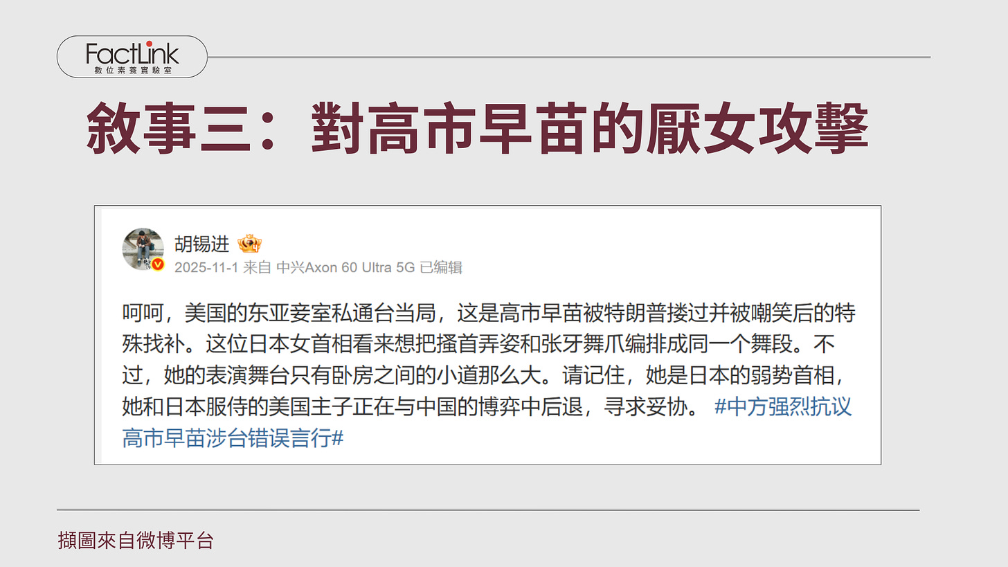 (3)本次中國輿論攻擊更特殊的一點是針對高市的女性身分,首先由時政評論大V帳號以歧視性的語言形容高市與台灣及其他國家領導人的互動,帶動網路風向,再進一步以男女關係比喻日本與台灣、美國的關係。