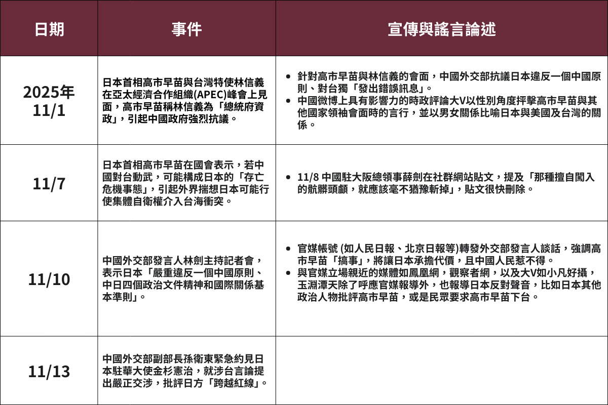 本篇報告分析高市早苗成為日本首相以來,2025年11月至12月初之間,中國在網路上發動論述攻勢的行動者與敘事主軸。希望透過解析,掌握中國發動宣傳時,從官方、官媒到大V等不同行動者的角色與敘事劇本。