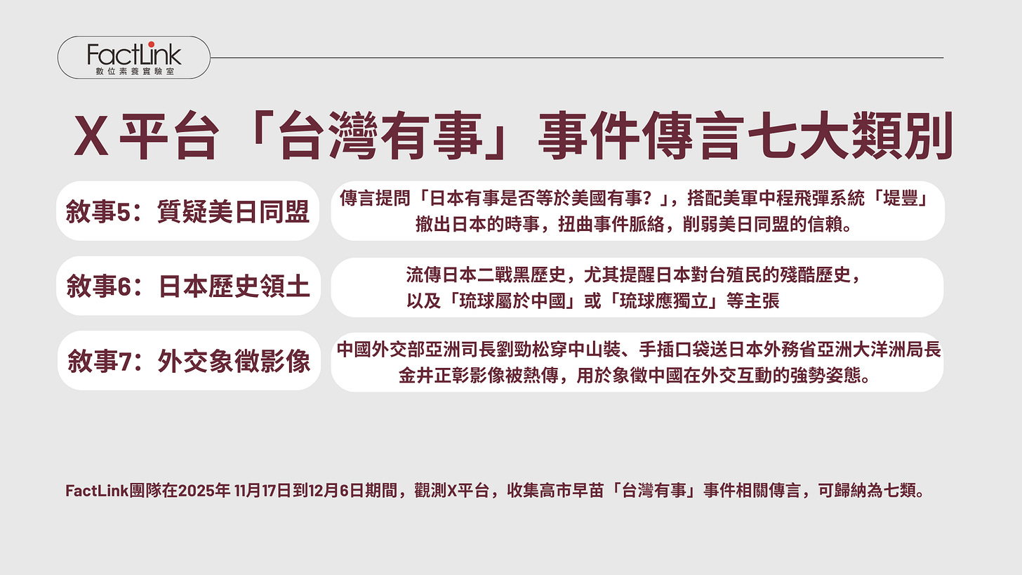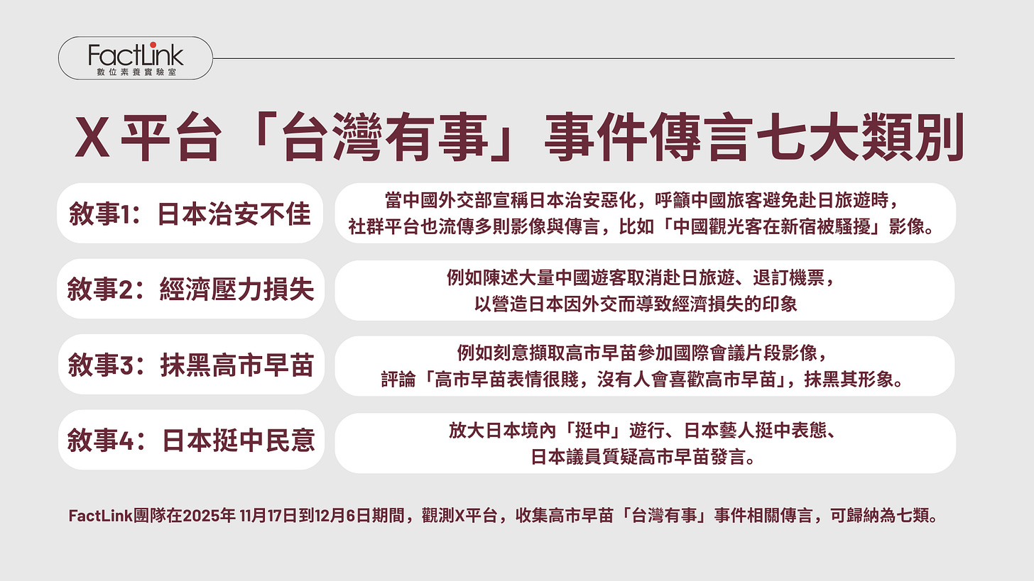 FactLink研究團隊在2025年11月1日到12月6日期間,觀測X平台,收集高市早苗「台灣有事」事件相關傳言,可歸納為以下七類: