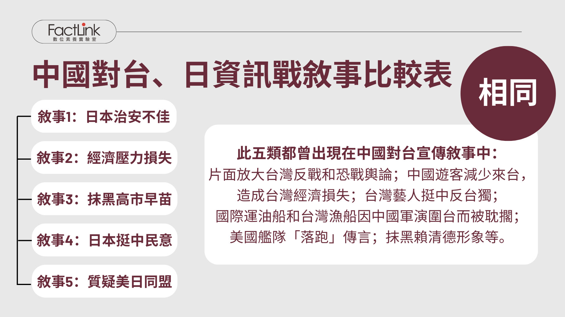 七大類敘事中,前五類敘事日本治安不佳、經濟壓力損失、抹黑高市早苗、日本挺中民意、質疑美日同盟,都曾出現在與中國對台宣傳敘事中。