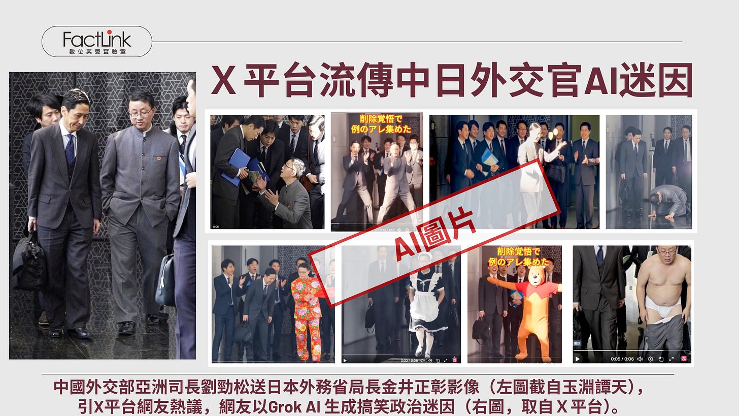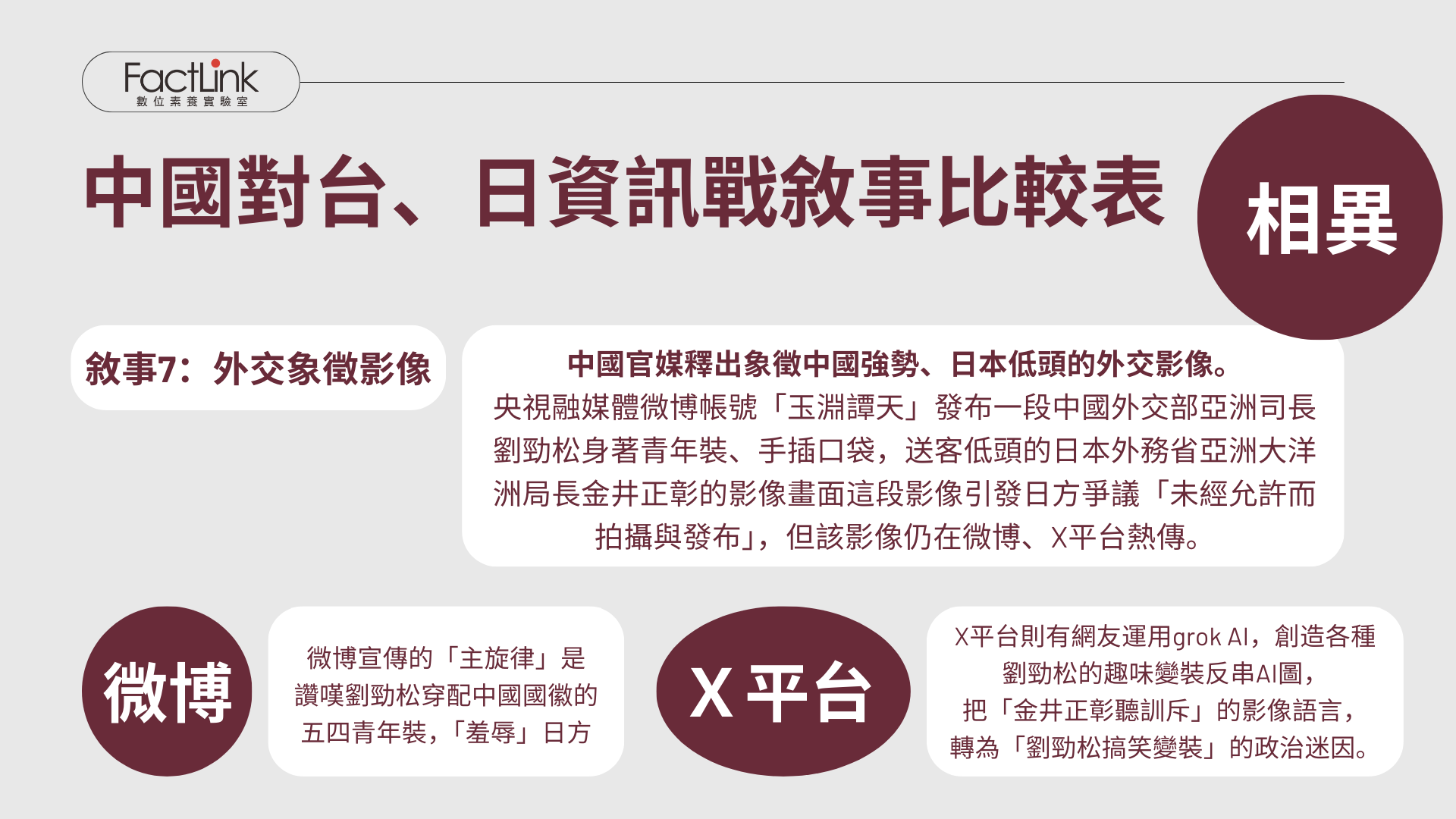 第七類敘事,中國央視融媒體帳號「玉淵譚天」釋出中國外交部亞洲司長劉勁松身著青年裝、手插口袋,日本外務省亞洲大洋洲局長金井正彰送客低頭的,影像語言象徵中國強勢、日本低頭的外交影像。在A技術的發展上,也在X平台出現大量嘲笑日外交官的政治迷因。
