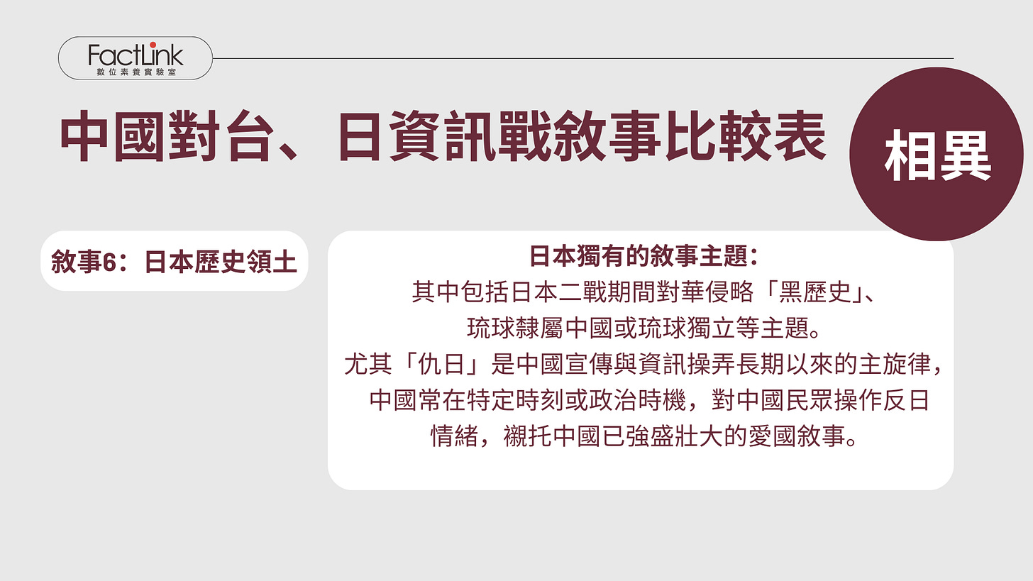 觀察發現三:對台與對日資訊戰敘事主題的相似與差異
