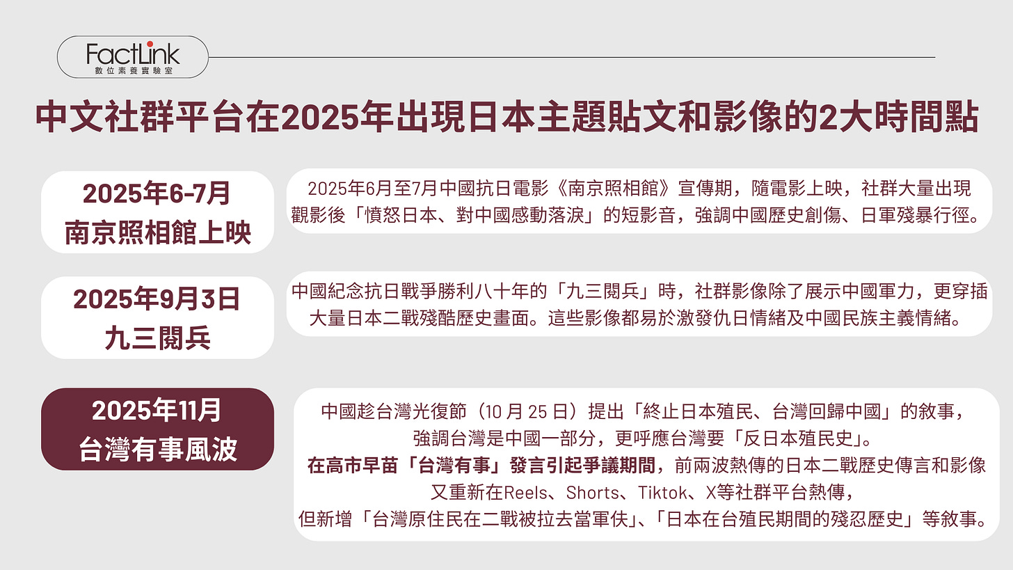 第六類敘事「日本歷史領土」屬於日本獨有的敘事主題;FactLink研究團隊觀測到,中文社群平台在2025年有兩個時間點,第一是2025年6-7月中國抗日電影《南京照相館》宣傳期,另一個波段是中國紀念抗日戰爭勝利八十年的「九三閱兵」時,均出現大量跟日本相關的貼文和影像。