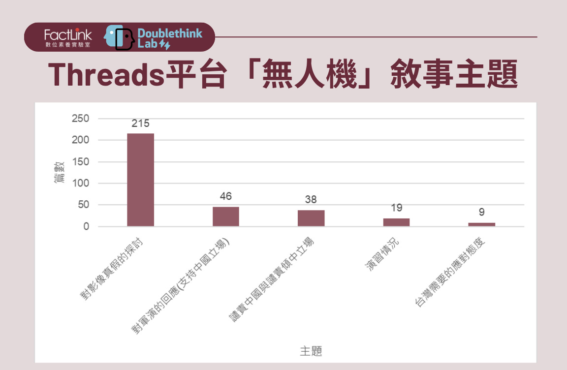 反觀Threads平台關於軍演的討論,台灣網友高比例質疑無人機影像,並動手查核。本研究收集的270筆Threads貼文中,就有近80%的比例(215篇)探討無人機影像真假。而且貼文意見多元,其中有54.4%質疑無人機影片的真實性。