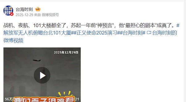 2025年12月29日,中共發動正義使命軍演的首日,中國央視在2025年12月29日晚間7點新聞聯播時,於新聞播報中穿插「無人機拍攝到台北101」畫面。當晚7-9點之間,解放軍微博帳號「中國軍號」釋出「解放軍無人機俯瞰台北101大廈」影像、央視新聞和央視軍事的微博帳號,東部戰區發出「這麼近那麼美隨時到台北」MV,中國論壇文章也刊出一張台北全景黑白照片,軍事博主和對台帳號等齊力發動此主題。台灣媒體跟進報導,Threads網友也跟進熱議。