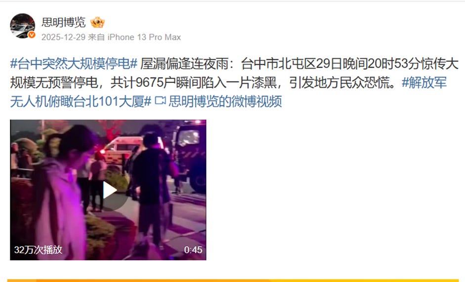 不相干的當天台中停電事件也被某些微博貼文利用,編造出上有軍機壓境,下有緊急停電,使得台灣民眾手足無措的景象。