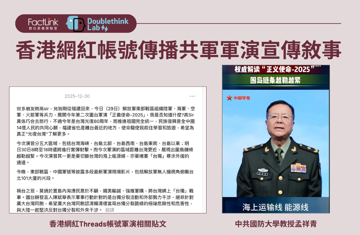 此外,一位自稱香港網紅的 Threads 帳號,自稱致力宣傳「愛國愛港正能量,講好中國故事及香港故事」。該帳號於12月30日的貼文中,將「正義使命」軍演定調為「針對台獨,而非全體台灣人」,此一說法與國台辦立場相互呼應。進一步分析,其另一篇貼文還聲稱:「今次軍演的區域距離台灣更近,展現出圍島鏈條愈勒愈緊。今次演習其一更是要切斷台灣的海上能源線」、「堵塞台獨尋求外援通道」。該敘事內容與解放軍微博帳號「中國軍號」於12月29日發布影片中,中共國防大學教授孟祥青的評論高度一致,顯示其論述是宣傳且擴大解放軍宣傳敘事。不過整體而言,該帳號互動量低,並未引起擴散和關注。