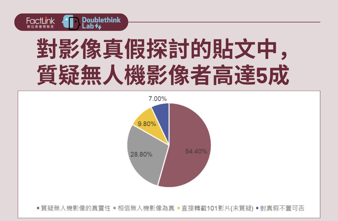 圖說:在探討無人機影像真假的270篇貼文中,相關主題的比例。其中「質疑無人機影像真實性」的比例最高,為54.4%。