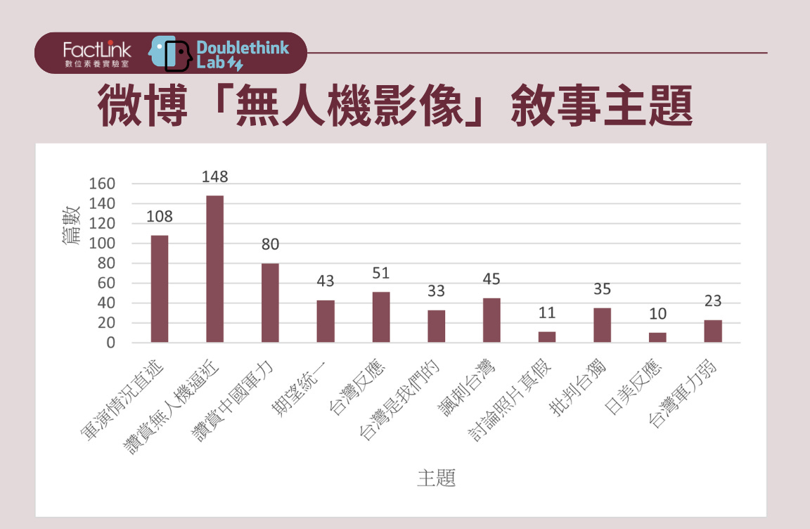 這些微博的敘事主題相當一致,一邊讚賞中國無人機在軍演期間逼近台北101大樓,一邊諷刺台灣軍力薄弱。從本次研究分析在軍演中與無人機、台北101影像相關的458則微博貼文主題分析中,可以看到質疑真偽的僅有11則;讚賞無人機貼近101大樓的貼文數量最多,再者是轉貼軍演情況的影片或照片,為數不少的貼文更表達出對於中國軍力的信心。東部戰區融媒體中心以「這麼近那麼美,隨時到台北」短影音,也成了微博貼文的主題梗。軍事博主在貼文中標註此標語,接續衍伸,稱無人機到台北,就像是在自家巡視,「只差登陸」。